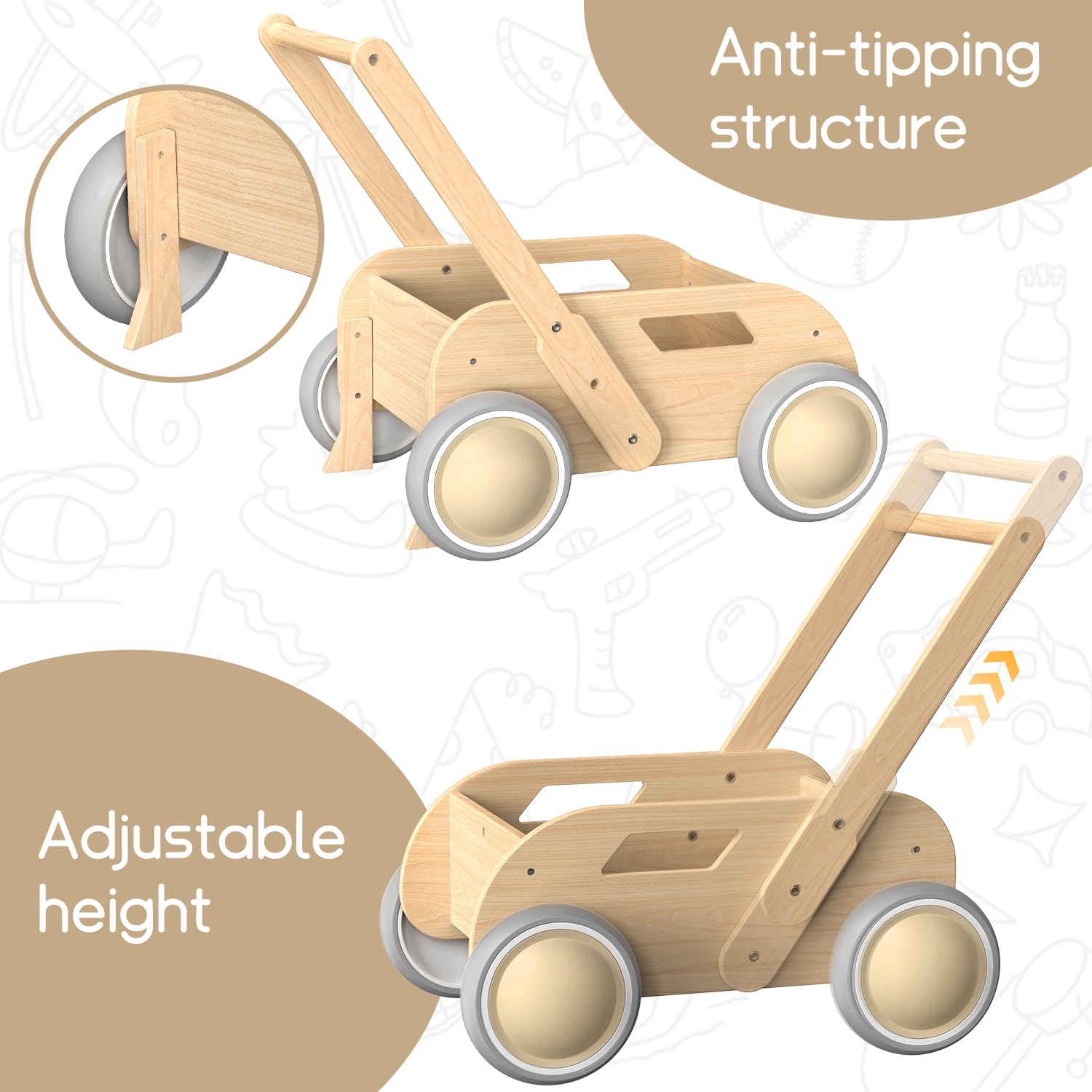 Montessori Wooden Baby Push Walker with Adjustable Speed | Baby Activity Learning Walker for Boys & Girls | Natural Wood Baby Gift